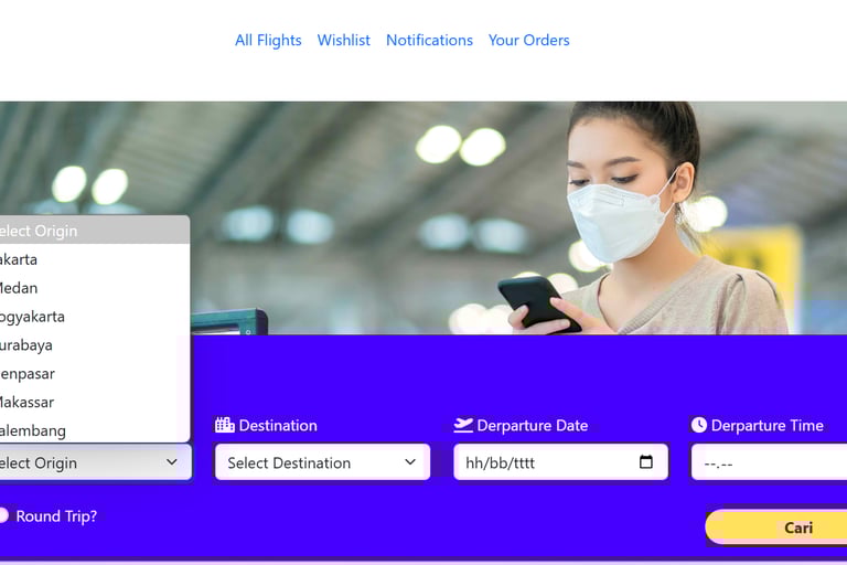 Website pemesanan tiket pesawat ini dirancang untuk memberikan pengalaman pengguna yang mudah dan efisien, dengan fitur utama seperti melihat jadwal penerbangan secara lengkap termasuk maskapai, waktu keberangkatan, dan kedatangan. Fitur wishlist memungkinkan pengguna menyimpan penerbangan favorit untuk dipesan di lain waktu, sementara notifikasi memberikan informasi terkait status pemesanan, perubahan jadwal, atau penawaran khusus. Pengguna juga dapat mengakses riwayat pemesanan melalui fitur your order yang menampilkan detail setiap transaksi. Proses pemesanan dimulai dengan memilih bandara keberangkatan, bandara tujuan, tanggal penerbangan, waktu penerbangan, serta opsi pulang-pergi atau sekali jalan, sehingga perjalanan dapat disesuaikan dengan kebutuhan.